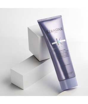 Ce soin fondant à la texture de lait et à la couleur lavande répare profondément les cheveux blonds sensibilisés par les mèches ou la décoloration.