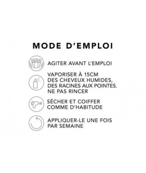 Agitez et vaporisez uniformément sur cheveux humides, environ à 15cm, des racines jusqu'au pointes. Ne pas rincer. Séchez et coiffez comme d'habitude. Pour un résultat optimal, utilisez-le une fois par semaine.