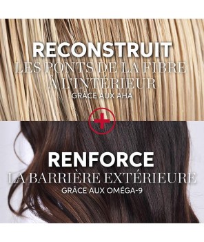 - Technologie brevetée à base d'AHA et d'Oméga-9 pour reconstruire et renforcer les cheveux de l'intérieur à l'extérieur
